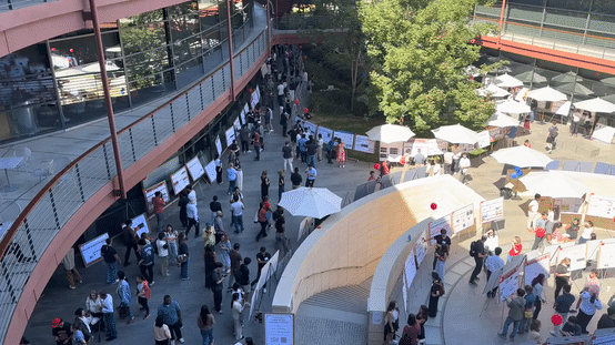 Researchers enjoying the Stanford Bio-X Seed Grants Poster Session at the Clark Center on August 28, 2025.